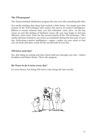 73The TM program?The Transcendental Meditation program fits into your life something like this:You awake wishing that sleep had worked a little better. You begin your first session of the TM technique and contact the source of creative intelligence. Fifteen to twenty minutes later, you feel refreshed, clear, alive. As the day wears on and this feeling of freshness wears off, you may begin to feel less efficient, more tired. Time for the second period of the TM technique. TM%u2019s restful alertness dissolves any stress accumulated during the first part of your day. Enlivening creative intelligence%u2014again%u2014wakes up your mind so that you are fresh and alert, ready for the second half of your day.TM twice each day?Yes, first thing on arising and then about half-way through your day%u2014before breakfast and before dinner. That%u2019s the program.Do I have to do it twice every day?It%u2019s your choice, but doing TM twice a day brings the best results.