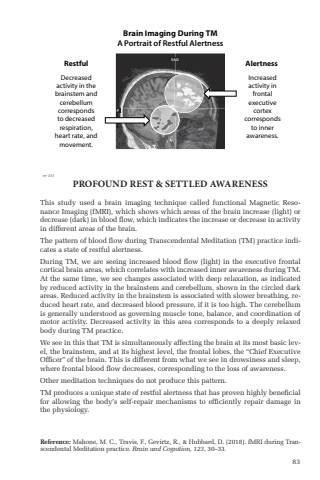 83This study used a brain imaging technique called functional Magnetic Resonance Imaging (fMRI), which shows which areas of the brain increase (light) or decrease (dark) in blood fl ow, which indicates the increase or decrease in activity in different areas of the brain. The pattern of blood fl ow during Transcendental Meditation (TM) practice indicates a state of restful alertness. During TM, we are seeing increased blood fl ow (light) in the executive frontal cortical brain areas, which correlates with increased inner awareness during TM. At the same time, we see changes associated with deep relaxation, as indicated by reduced activity in the brainstem and cerebellum, shown in the circled dark areas. Reduced activity in the brainstem is associated with slower breathing, reduced heart rate, and decreased blood pressure, if it is too high. The cerebellum is generally understood as governing muscle tone, balance, and coordination of motor activity. Decreased activity in this area corresponds to a deeply relaxed body during TM practice. We see in this that TM is simultaneously affecting the brain at its most basic level, the brainstem, and at its highest level, the frontal lobes, the %u201cChief Executive Offi cer%u201d of the brain. This is different from what we see in drowsiness and sleep, where frontal blood fl ow decreases, corresponding to the loss of awareness. Other meditation techniques do not produce this pattern. TM produces a unique state of restful alertness that has proven highly benefi cial for allowing the body%u2019s self-repair mechanisms to effi ciently repair damage in the physiology.AlertnessIncreasedactivity infrontalexecutivecortexcorrespondsto innerawareness.Brain Imaging During TMA Portrait of Restful AlertnessRestfulDecreasedactivity in thebrainstem andcerebellumcorrespondsto decreasedrespiration,heart rate, andmovement.SAGPtm-004PROFOUND REST & SETTLED AWARENESSReference: Mahone, M. C., Travis, F., Gevirtz, R., & Hubbard, D. (2018). fMRI during Transcendental Meditation practice. Brain and Cognition, 123, 30%u201333.