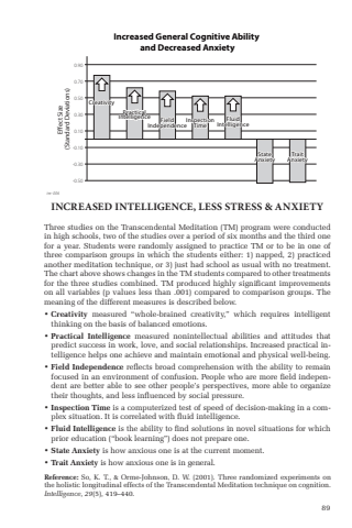 89Three studies on the Transcendental Meditation (TM) program were conducted in high schools, two of the studies over a period of six months and the third one for a year. Students were randomly assigned to practice TM or to be in one of three comparison groups in which the students either: 1) napped, 2) practiced another meditation technique, or 3) just had school as usual with no treatment. The chart above shows changes in the TM students compared to other treatments for the three studies combined. TM produced highly signifi cant improvements on all variables (p values less than .001) compared to comparison groups. The meaning of the different measures is described below.%u2022 Creativity measured %u201cwhole-brained creativity,%u201d which requires intelligent thinking on the basis of balanced emotions. %u2022 Practical Intelligence measured nonintellectual abilities and attitudes that predict success in work, love, and social relationships. Increased practical intelligence helps one achieve and maintain emotional and physical well-being.%u2022 Field Independence refl ects broad comprehension with the ability to remain focused in an environment of confusion. People who are more fi eld independent are better able to see other people%u2019s perspectives, more able to organize their thoughts, and less infl uenced by social pressure. %u2022 Inspection Time is a computerized test of speed of decision-making in a complex situation. It is correlated with fl uid intelligence. %u2022 Fluid Intelligence is the ability to fi nd solutions in novel situations for which prior education (%u201cbook learning%u201d) does not prepare one.%u2022 State Anxiety is how anxious one is at the current moment. %u2022 Trait Anxiety is how anxious one is in general.0.900.700.500.300.10-0.10-0.30-0.50CreativityPracticalIntelligence FieldIndependenceInspection TimeFluidIntelligenceState AnxietyTraitAnxietyEfiect Size(Standard Deviations)Increased General Cognitive Abilityand Decreased Anxietytm-006INCREASED INTELLIGENCE, LESS STRESS & ANXIETYReference: So, K. T., & Orme-Johnson, D. W. (2001). Three randomized experiments on the holistic longitudinal effects of the Transcendental Meditation technique on cognition. Intelligence, 29(5), 419%u2013440.