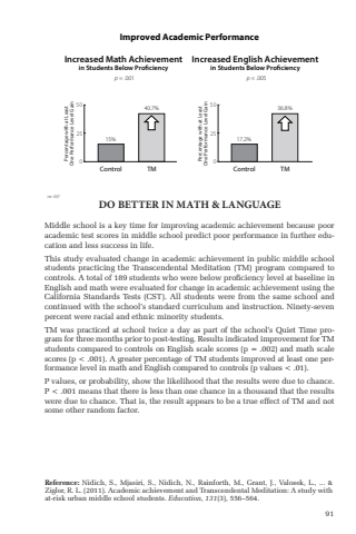 91Middle school is a key time for improving academic achievement because poor academic test scores in middle school predict poor performance in further education and less success in life. This study evaluated change in academic achievement in public middle school students practicing the Transcendental Meditation (TM) program compared to controls. A total of 189 students who were below profi ciency level at baseline in English and math were evaluated for change in academic achievement using the California Standards Tests (CST). All students were from the same school and continued with the school%u2019s standard curriculum and instruction. Ninety-seven percent were racial and ethnic minority students. TM was practiced at school twice a day as part of the school%u2019s Quiet Time program for three months prior to post-testing. Results indicated improvement for TM students compared to controls on English scale scores (p = .002) and math scale scores (p < .001). A greater percentage of TM students improved at least one performance level in math and English compared to controls (p values < .01).P values, or probability, show the likelihood that the results were due to chance. P < .001 means that there is less than one chance in a thousand that the results were due to chance. That is, the result appears to be a true effect of TM and not some other random factor. Control TMImproved Academic Performance Percentage with at Least One Performance Level Gain02550 Percentage with at Least One Performance Level Gain02550 40.7%15%Control TM36.8%17.2%Increased Math Achievementin Students Below ProficiencyIncreased English Achievementin Students Below Proficiencyp = .001 p = .005tm-007DO BETTER IN MATH & LANGUAGEReference: Nidich, S., Mjasiri, S., Nidich, N., Rainforth, M., Grant, J., Valosek, L., ... & Zigler, R. L. (2011). Academic achievement and Transcendental Meditation: A study with at-risk urban middle school students. Education, 131(3), 556%u2013564.